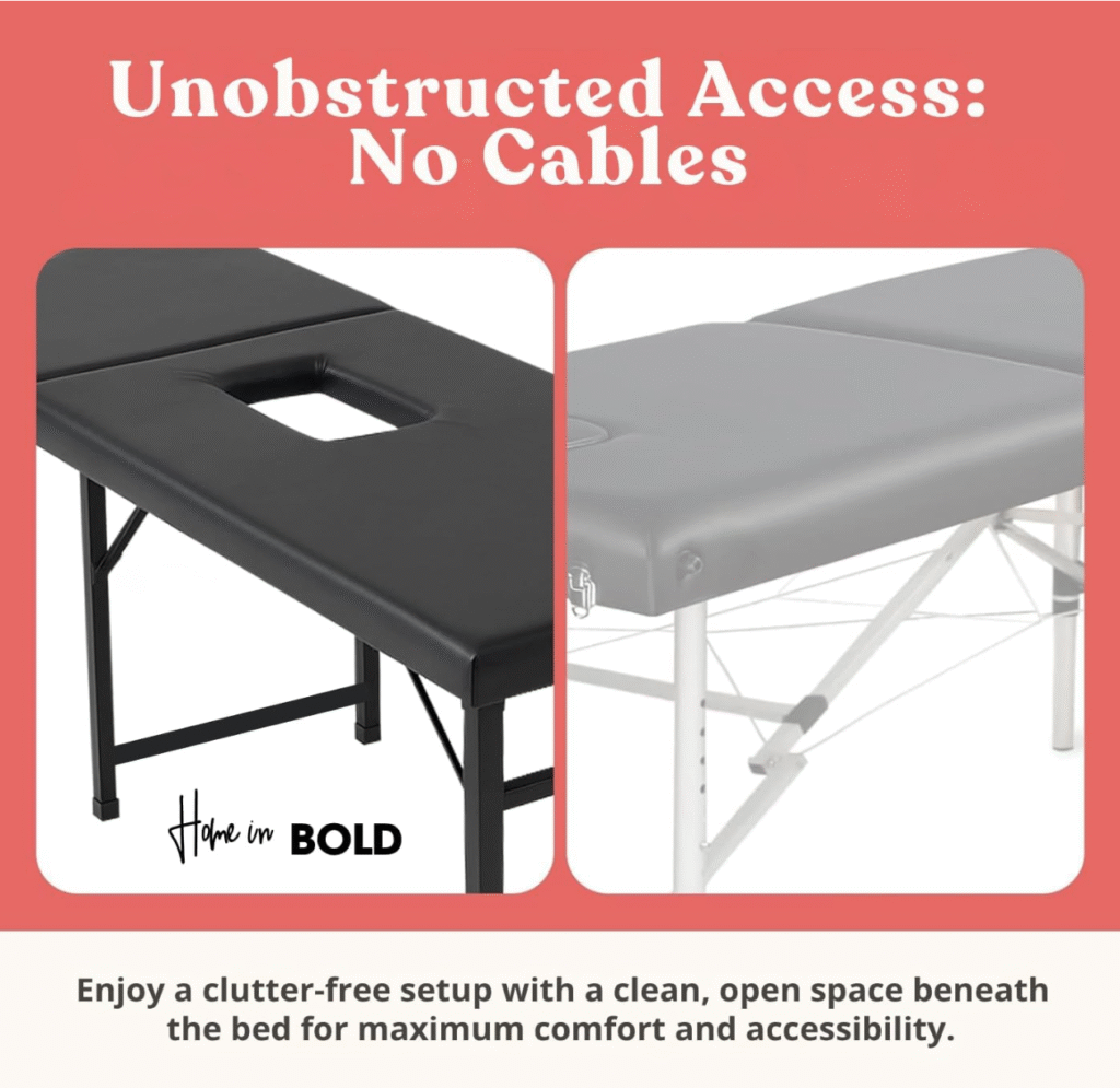 - Open under-frame design no bars, no obstructions, full access
