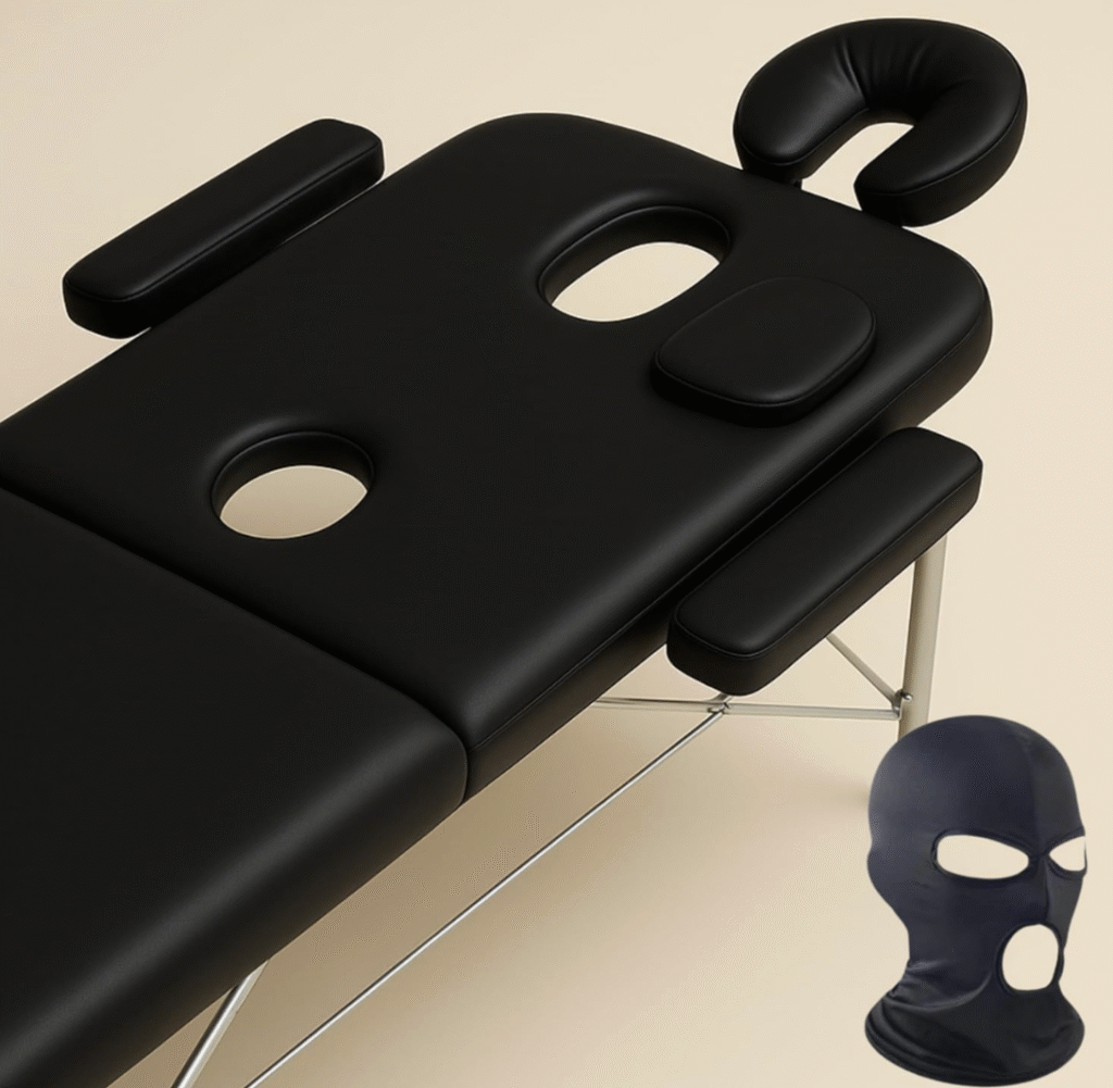 The base Milking Table (the one with the big glory hole) comes with a soft polyester privacy mask that covers his face when you want to dial down the visuals and dial up the sensation. It’s lightweight, comfy, and gives you that “who knows what’s going on behind curtain number two” vibe without feeling like a gag from a thrift store.